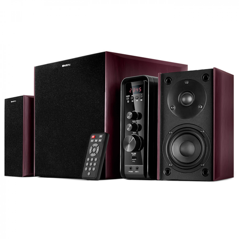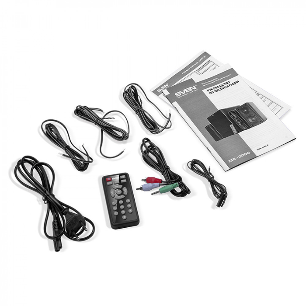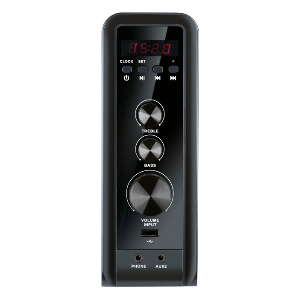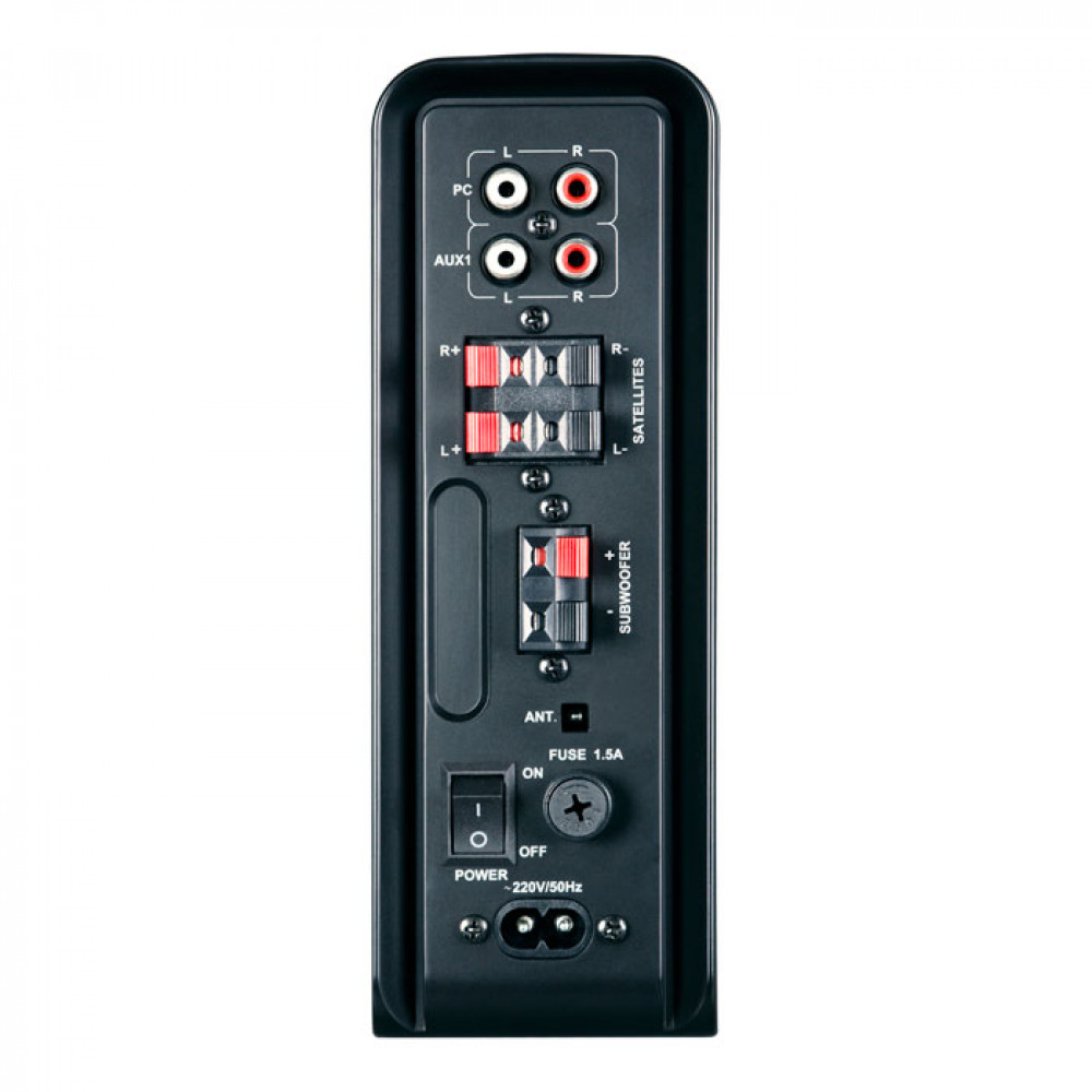 Элементы управления (регуляторы НЧ, ВЧ) устройства и его коммутации с другими источниками звука (cмартфоном, DVD, мультимедийными проигрывателями) очень удачно объединены с блоком усилителя. Это и есть сердцевина акустической системы MS-3000. В небольшом корпусе, по размерам похожим на книгу, помимо регуляторов присутствуют разъемы для подключения наушников, флешки и SD-карты, кнопки переключения входов, FM-тюнер. Эти опции превращают ее в музыкальный центр и свидетельствуют о высокой автономности системы. Для того чтобы не запутаться в многообразии функций, контролировать состояние акустики можно с помощью LED-дисплея. Если же пользователь ищет короткий путь к сердцу модели, он может воспользоваться пультом дистанционного управления. Этот золотой ключик содержит в себе те же функции управления, что и блок усилителя с существенным отличием: он значительно легче и меньше последнего.