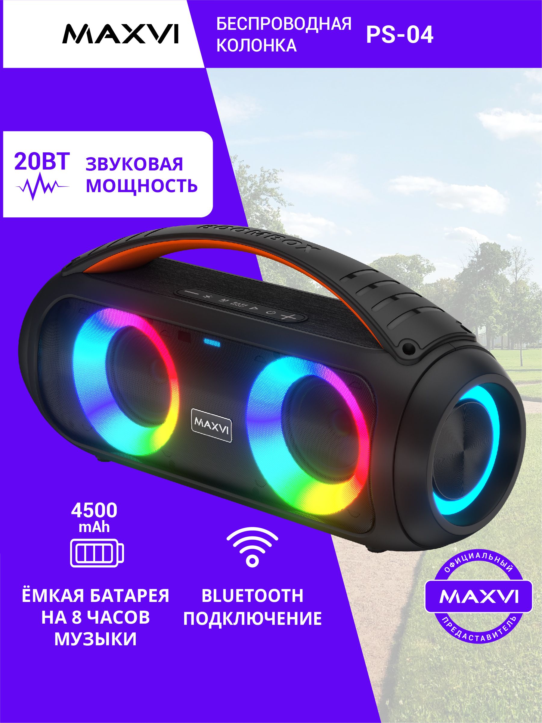 номинальная мощность 20 Вт, воспроизведение с USB/microSD, питание от аккумулятора, BT 5.3, AUX, время работы: 8 ч.