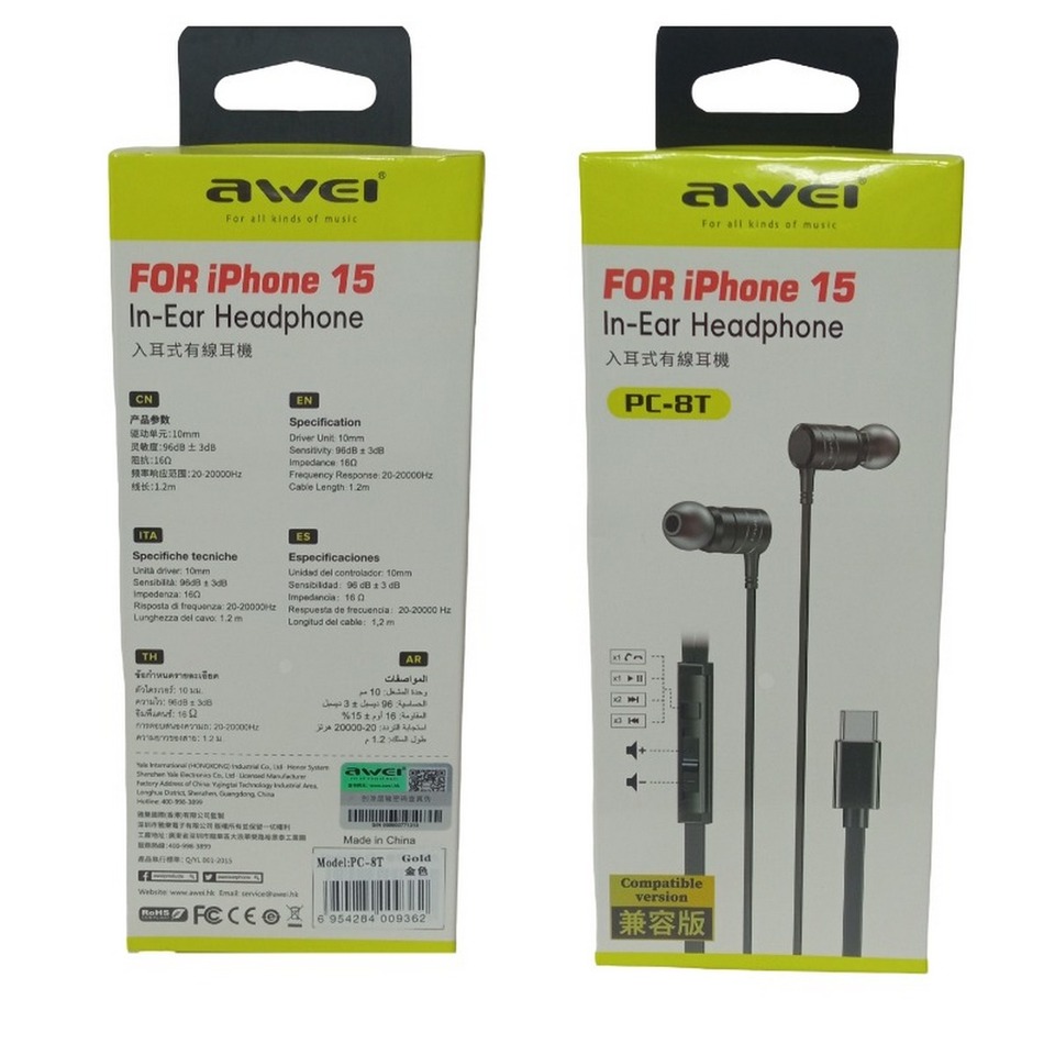 Наушники проводные Awei PC-8T выполнены в современном дизайне. Конструкция внутриканальные, тип подключения проводные, подключение USB C, штекер прямой, подвод кабеля двусторонний, длина кабеля 1.2 м, тип кабеля плоский, импеданс 16 Ом, частотный диапазон 20 20000 Гц, чувствительность 96 дБ, тип излучателей динамические, микрофон на кабеле, регулировка громкости.