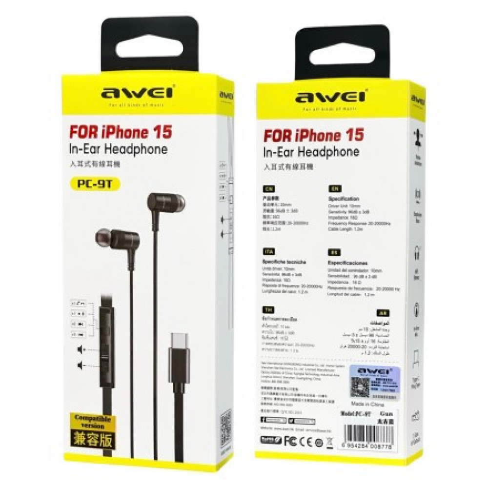 Стереонаушники Awei PC-9T с микрофоном Type-C 1.2м. Наслаждайтесь превосходным качеством звука с наушниками-вкладышами Awei PC-9T. Их разъем USB-C обеспечивает простоту подключения, а конструкция вкладыша обеспечивает шумоизоляцию для более захватывающего прослушивания. Благодаря кристально чистому звуку и удобной посадке Awei PC-9T идеально подходят для всех ваших аудиопотребностей. Приводной блок: 10 мм. Чувствительность: 96 дБ±348. Импеданс: 160. Диапазон частотной характеристики: 20-20000 Гц. Длина линии: 1,2 м.