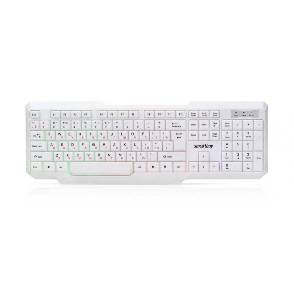 стандартная для ПК, мембранная, пластик, интерфейс подключения - USB-A, подсветка, кириллица: да, цвет белый