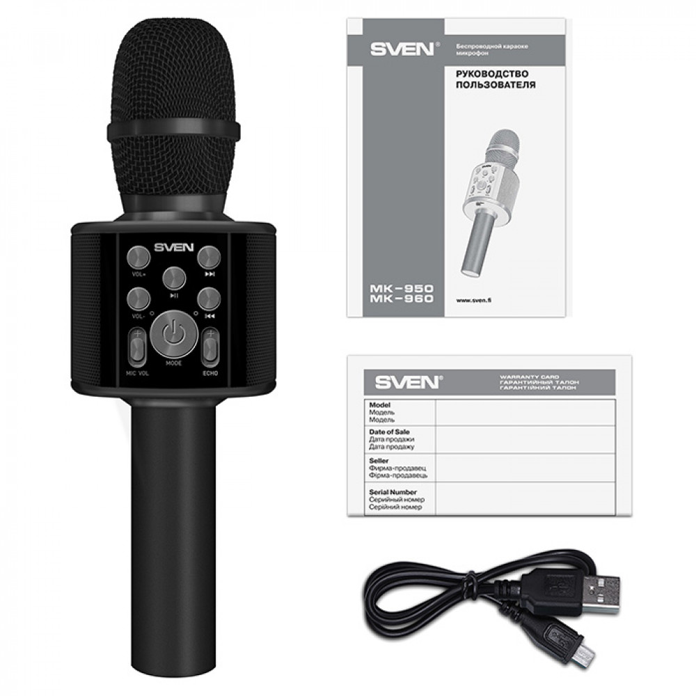 В этом небольшом устройстве есть все, что нужно: встроенный динамик, возможность воспроизведения музыки с microSD карт памяти, регуляторы уровня громкости микрофона и эффекта «эхо», кнопки воспроизведения и переключения треков. Также SVEN MK-960 может проигрывать музыку, получая её по Bluetooth c компьютера или мобильных устройств. И никаких лишних проводов, ведь в микрофоне есть съемный литий-ионный аккумулятор, который работает до 8 часов без подзарядки.