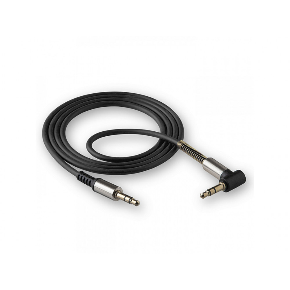 Круглый прорезиненный AUX-кабель с 3-контактными 3,5 mini-jack разъемами цвета gold. Один разъем имеет угловую форму и пружину у основания корпуса, другой разъем имеет ребристую прорезиненную защиту у основания корпуса, что повышает износостойкость данного кабеля. Длина 1 метр.