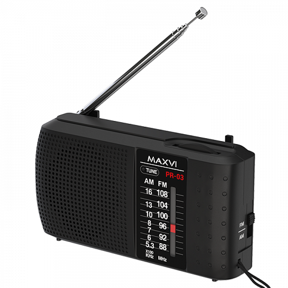 Портативный приёмник Maxvi PR-03 с аналоговым выбором частоты обеспечивает прослушивание радиостанций, вещающих в частотных диапазонах FM и AM. Работает как от сети переменного тока, так и от пальчиковых батареек (АА). К Maxvi PR-03 можно подключить наушники (разъем 3,5 mini-jack).