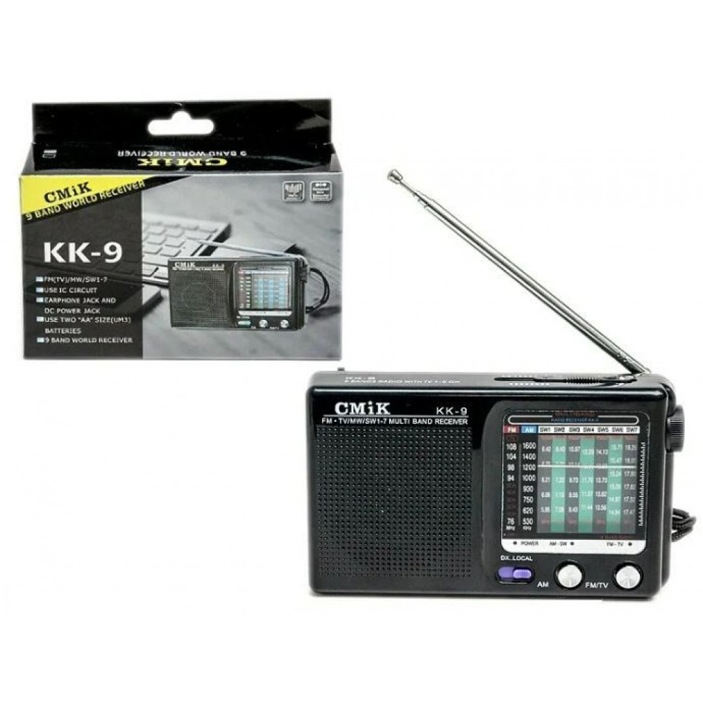 Радиоприемник карманный Cmik KK-9 с работой от батареек и возможностью работы от сети, цвет радио серебристый. Данный портативный карманный радиоприемник принимает FM частоты 76 – 108 МГЦ, AM частоты 530 – 1600 KHZ, SW частоты 5,95 – 18 МГЦ, переключение диапазонов частот осуществляется кнопками переключения на корпусе прибора. Настройка принимаемых радиочастот осуществляется вручную. Функции Bluetooth блютуз и MP3 у данной модели радио нет. Само радио звучит громко и качественно, несмотря на компактный размер прибора. Мощность динамика 0,5W. Есть гнездо для подключения наушников, разъем 3,5 мм mini-jack. Включение и выключение радиоприемника осуществляется при помощи колесика регулировки громкости на боковой части прибора слева. Полная подробная инструкция по применению на русском языке прилагается. Есть выносная телескопическая антенна длиной 34 см. Работа радиоприемника осуществляется от двух батареек АА, есть в комплекте. Кроме того, приемник может работать от сети при напряжении не более DC3V. Кабеля подключения к сети НЕТ в комплекте. Есть наручный ремешок для более удобного ношения радио. Размер радио 13 х 7 х 2,7 см, вес с батарейками 140 г. Размер упаковки 14 х 11 х 4 см, вес 170 г. Сделано в Китае.