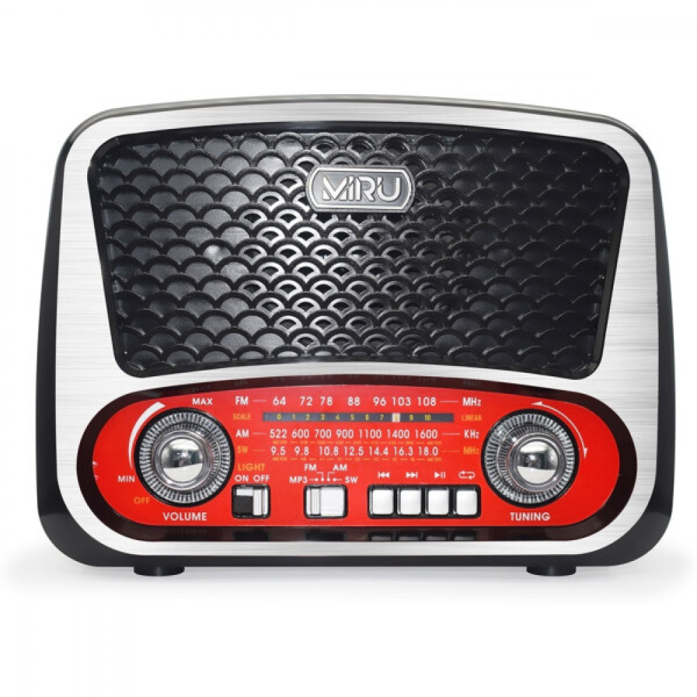 Радиоприемник MIRU SR-1019 имеет ретро дизайн и выполнен в черно-серебристом корпусе с красными вставками и представляет собой простое устройство для воспроизведения потокового радио вещания. Модель предусматривает всего один динамик, но этого вполне достаточно, чтобы вы получили насыщенный звук. Радиоприемник улавливает радио каналы в диапазоне FM, АМ и SW, гарантируя отличную связь благодаря встроенной телескопической антенне, которая способствует улучшению сигнала. MIRU SR-1019 имеет линейный аудио вход и поддержку чтения microSD карт, а наличие фонарика на боковой панели, будет отличным дополнением. Благодаря тому что, радиоприёмник работает не только от сети 220 В, но и от аккумулятора или батареек, он является мобильным устройством. Вы сможете взять его на пикник и наслаждаться трансляцией любимой радио передачи в компании с веселыми ведущими. Для управления устройства предусмотрены механические переключатели.