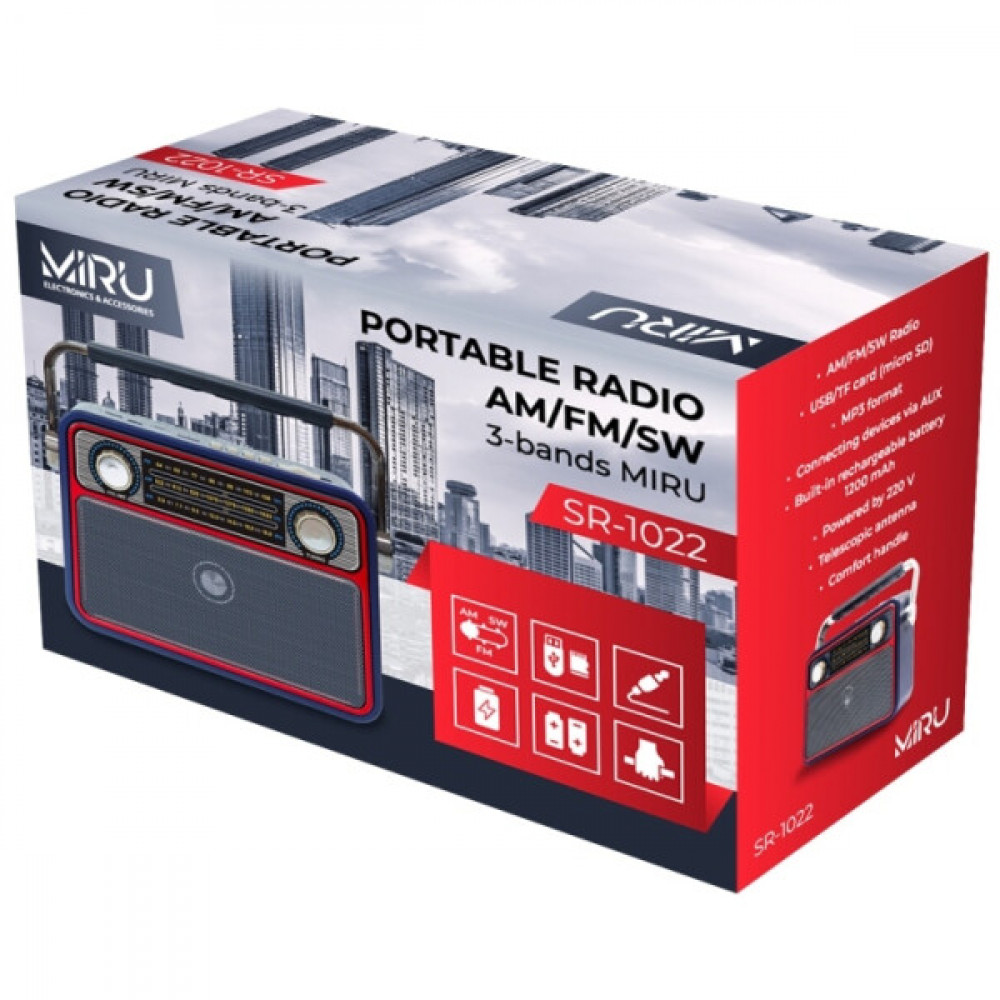Радиоприемник MIRU SR-1022 синего цвета имеет ретро дизайн, простой функционал и обеспечивает приём сигналов в диапазоне FM, AM и SW. Аналоговый способ настройки частоты предполагает более точное и быстрое улавливание нужного канала. Для улучшения качества сигнала у радиоприемника имеется поворотная телескопическая антенна. Радиоприемник SR-1022 может работать как от сети 220В, так и аккумулятора. Устройство оснащено удобной, складывающейся ручкой, благодаря чему его будет легко переносить. Органы регулировки громкость и смена диапазонов расположены на передней панели приемника. Также предусмотрено проигрывание с USB и microSD накопителей. Данный радиоприемник отлично подойдет для туристов, дачников и просто любителей отдыха на природе.