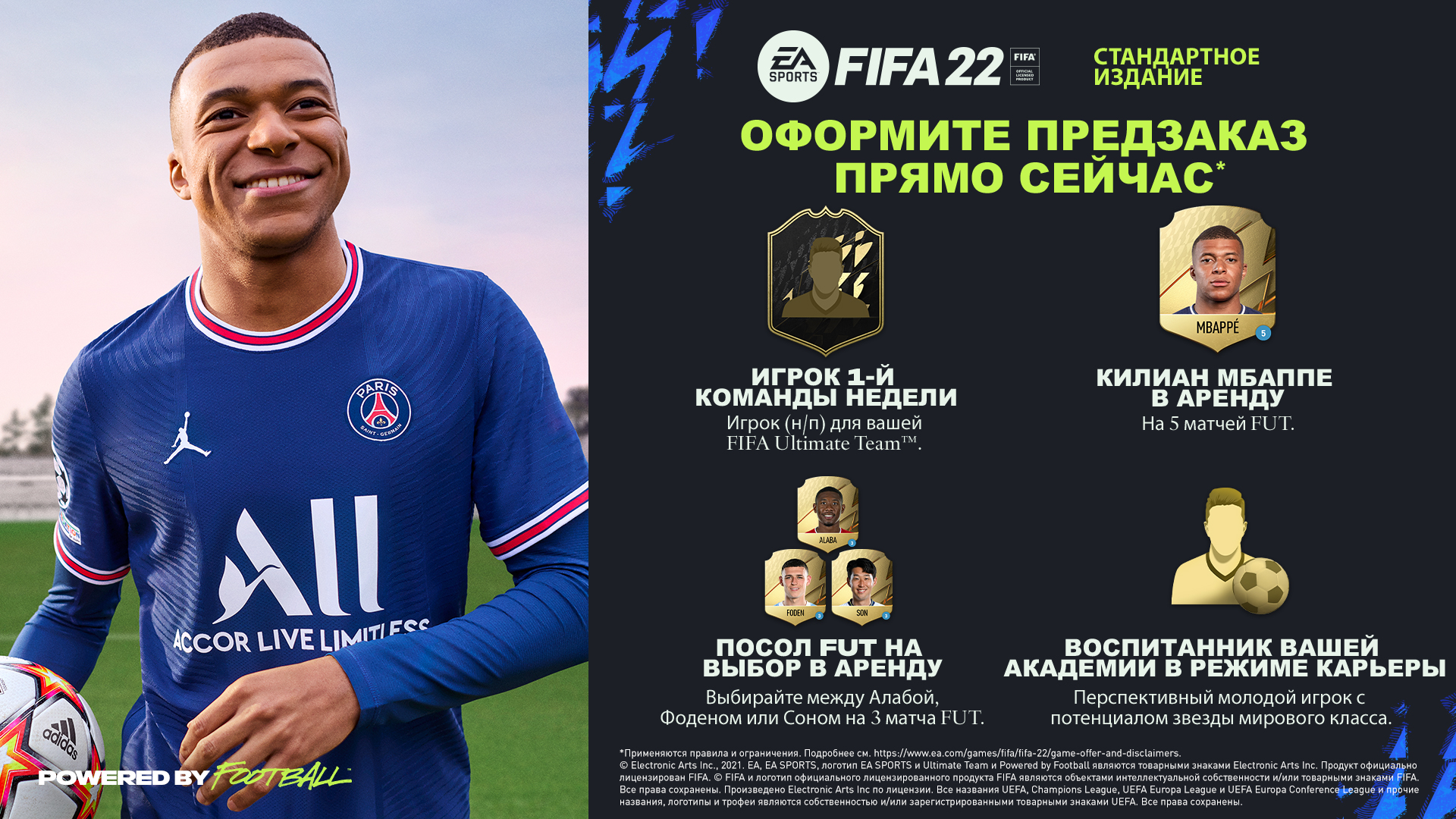 EA SPORTS FIFA 22 приближает игру к реальности с фундаментальными улучшениями игрового процесса и инновациями во всех режимах. Среди новых возможностей игрового процесса — большая стабильность на последнем рубеже благодаря изменению поведения вратарей, новая физика мяча, взрывные рывки, отдающие должное ускорению быстрейших футболистов мира, а также новые атакующие тактики, позволяющие контролировать игру команды. Воплотите свои футбольные мечты в режиме карьеры — создайте футбольный клуб и ведите его к славе. VOLTA FOOTBALL вознаграждает вас за вашу филигранную технику с измененным игровым процессом и новыми способами играть и прогрессировать в каждом сезоне. Соберите состав в Клубах Профи с расширенными возможностями персонализации команды и обновленным прогрессом, в котором вы полностью контролируете развитие вашего виртуального футболиста. Самые запомнившиеся футболисты вернутся в FIFA Ultimate Team в качестве новых Героев FUT, а благодаря новой структуре соревнований вам будет еще проще проверять свое мастерство в матчах с другими игроками.
